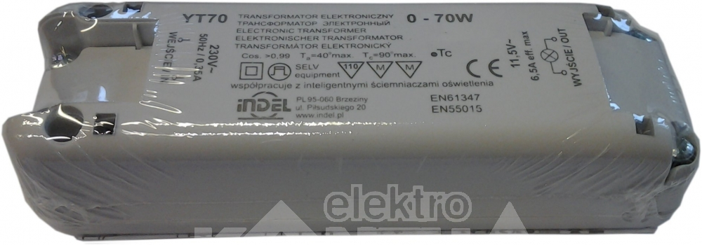 HALOGÉN TRANSZFORM. 230VACbe 11.5VACki 70Wmax IP40 118x36.5x29.5mm 115g YT70 DIMMERELHETŐ